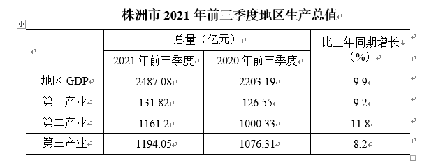 根据地区生产总值统一核算结果,前三季度,全市地区生产总值为2487.08亿元,按可比价格计算,同比增长9.9%。分产业看,第一产业增加值131.82亿元,增长9.2%;第二产业增加值1161.2亿元,增长11.8%;第三产业增加值1194.05亿元,增长8.2%。