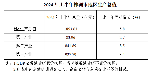 根据地区生产总值初步统一核算结果,2024年上半年全市地区生产总值为1853.63亿元,按不变价格计算,同比增长5.8%。分产业看,第一产业增加值83.96亿元,增长2.7%;第二产业增加值841.89亿元,增长8.5%;第三产业增加值927.79亿元,增长3.4%。