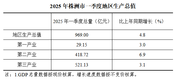 根据地区生产总值初步统一核算结果,2025年一季度全市地区生产总值为969.00亿元,按不变价格计算,同比增长4.8%。分产业看,第一产业增加值29.15亿元,增长3.0%;第二产业增加值418.72亿元,增长6.9%;第三产业增加值521.13亿元,增长3.1%。