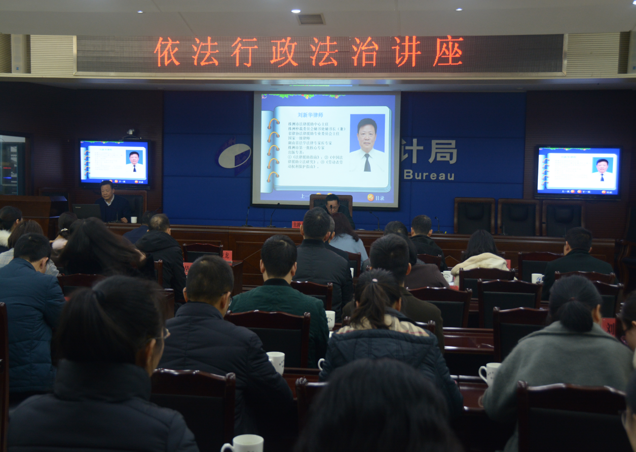为深入学习贯彻全面推进依法治国有关精神,切实提升全局干部运用法治思维和法治方式开展工作、解决问题的能力,11月29日,市统计局在十九楼会议室举办《依法行政》专题法治讲座,邀请了株洲市法律援助中心主任、一级律师刘新华授课。局党组成员、副局长姚应龙主持会议,全体在家局领导、机关干部职工聆听了此次讲座。