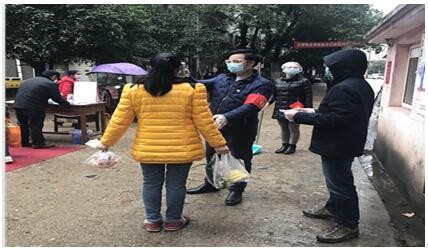 万泥塘社区队员刘爱民、肖功人、吴绪钊在社区主任的带领下,对进出本小区的人员测量体温,全面盘查进入小区人员和车辆,对出入人员开展防控宣传,对小区出入口设置的消毒垫喷酒84消毒液进行鞋底消毒,全面盘查聚众休闲,及时叫停三人以上(含三人)的人员聚集。
