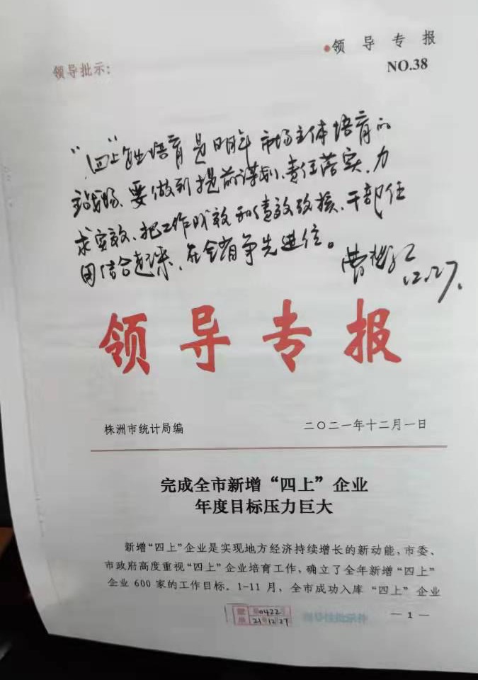 曹慧泉书记批示:“四上”企业培育是明年市场主体培育的主战场,要做到提前谋划、责任落实、力求实效,把工作成效和绩效考核、干部任用结合起来,在全省争先进位。