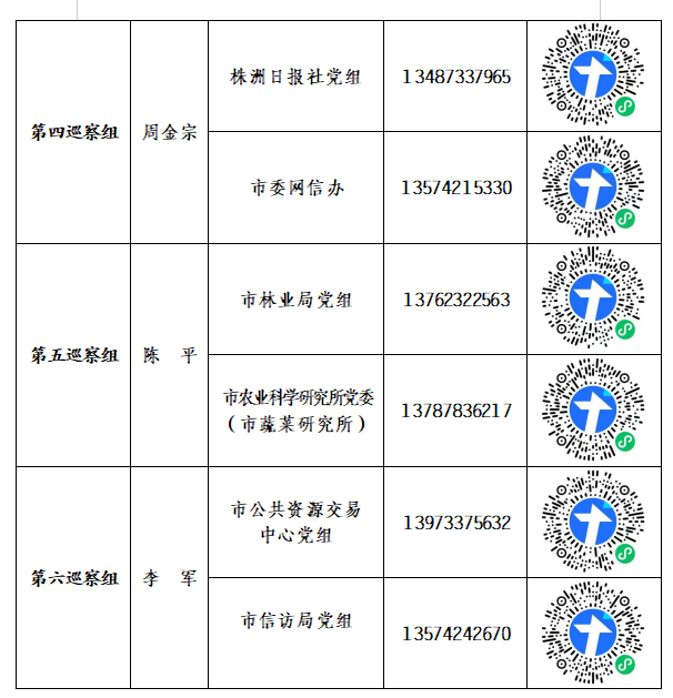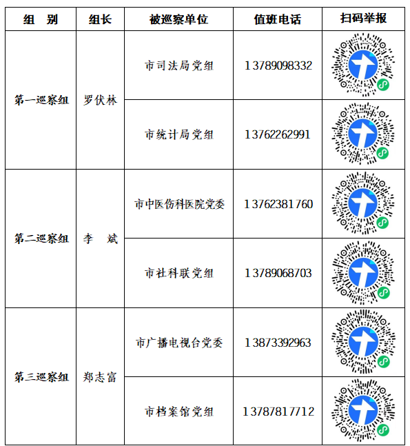 巡察期间,各巡察组设专门值班电话、征求意见箱等,受理反映被巡察党组织领导班子及其成员、市委管理的其他干部及下一级主要负责人、重要岗位主要负责人等问题的来信来电来访,重点是违反政治纪律、组织纪律、廉洁纪律、群众纪律、工作纪律和生活纪律等方面的举报和反映。对其他不属于巡察受理范围的信访问题,将按规定转交有关部门处理。现将各巡察组的值班电话(接听时间为8:00至18:00),以及扫码举报“二维码”予以公布。