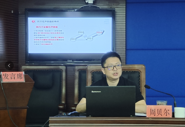 周贝尔以《关于经济普查工作的几点思考》为题,讲解了经济普查的历史,梳理了历次经济普查主要情况,结合实际工作认真分析了经济普查工作主要难点,特别对第五次全国经济普查中首次开展投入产出调查、重点关注新经济新业态、适时将普查工作情况纳入统计督查等新变化进行了详细介绍,最后就如何做好当前经济普查工作提出对策建议,为进一步做好全市第五次全国经济普查工作奠定了基础。