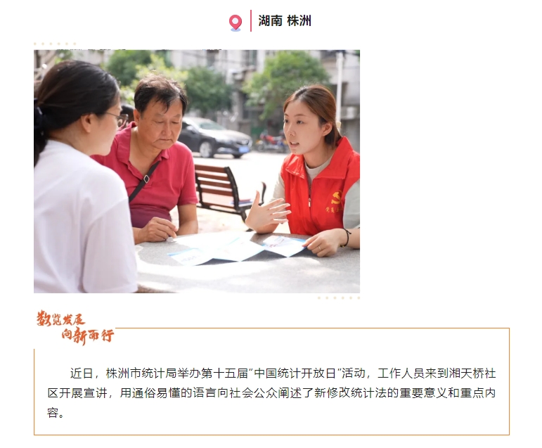 第十五届中国统计开放日,主题为“数览发展 向新而行”,各地举办了各具特色的宣传活动,展现75年来中国经济社会发展取得的辉煌成就,反映统计事业的蓬勃发展,介绍推进统计现代化改革的最新进展,推动社会各界走近统计、了解统计,其中株洲市统计局开放日活动备受瞩目,10月9日被中国信息报报道点赞。